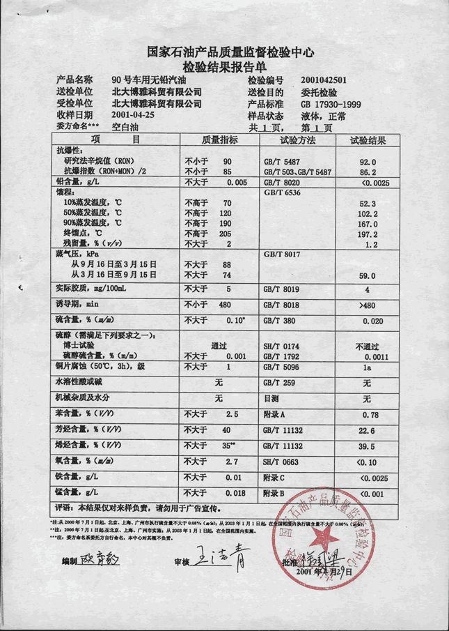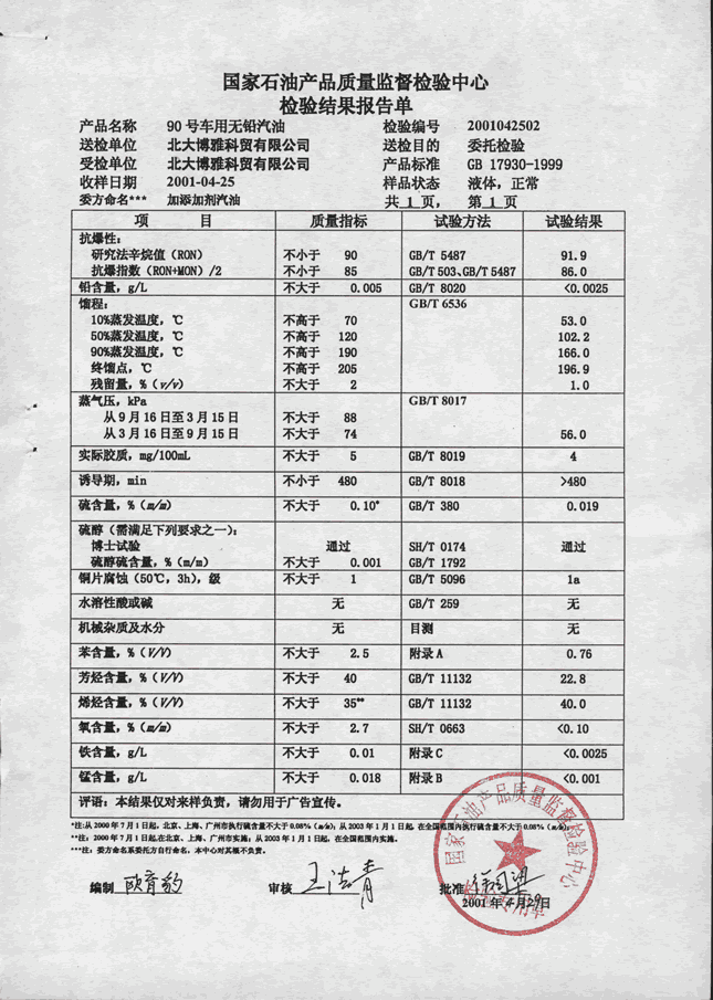 - 03.02.26, 国家石油产品检测中心检测结果表明北大博雅“纳米水”降低燃油品质