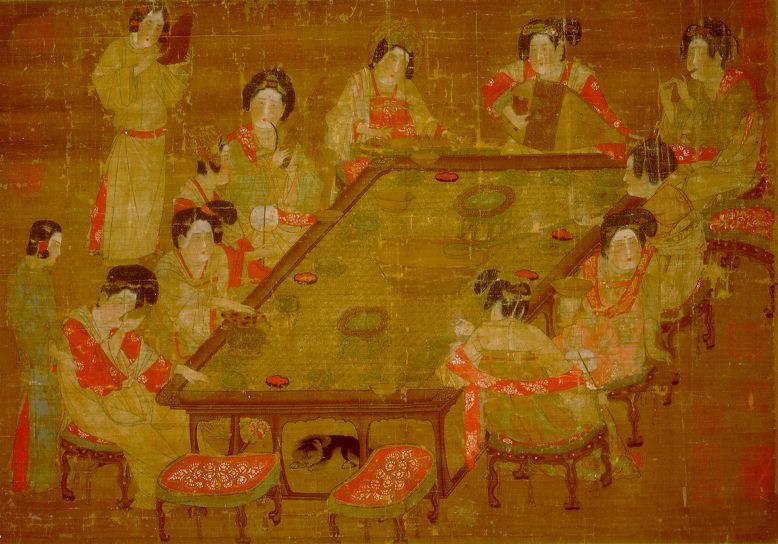 本幅无作者名款,画女乐十二人。十人围案而坐,中四人正吹奏笙、箫、古筝与琵琶诸乐器;侍立