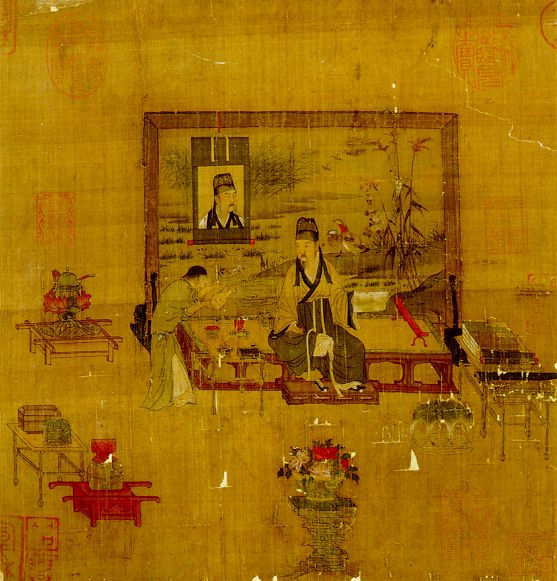 酒;榻后屏风,上悬主人写照;榻右棋桌与几各一,上设琴棋书画四事;又有行架矮几,上置杂什